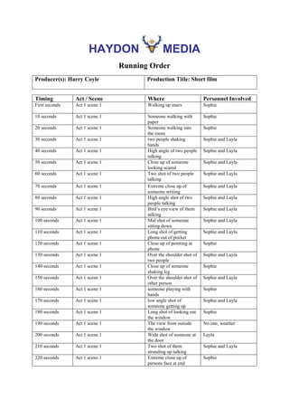 The running order document outlines the scenes and shots planned for a short film over 220 seconds. It details the timing, act, scene, location, and personnel involved in each shot. The film follows Sophie through Act 1 scene 1 as she walks up stairs, talks with Layla, looks scared, writes, gets a phone out, points at the phone, shakes her leg, gets up, looks out a window, and has an extreme close up of her face at the end. Layla is also involved in many of the conversation scenes with Sophie.