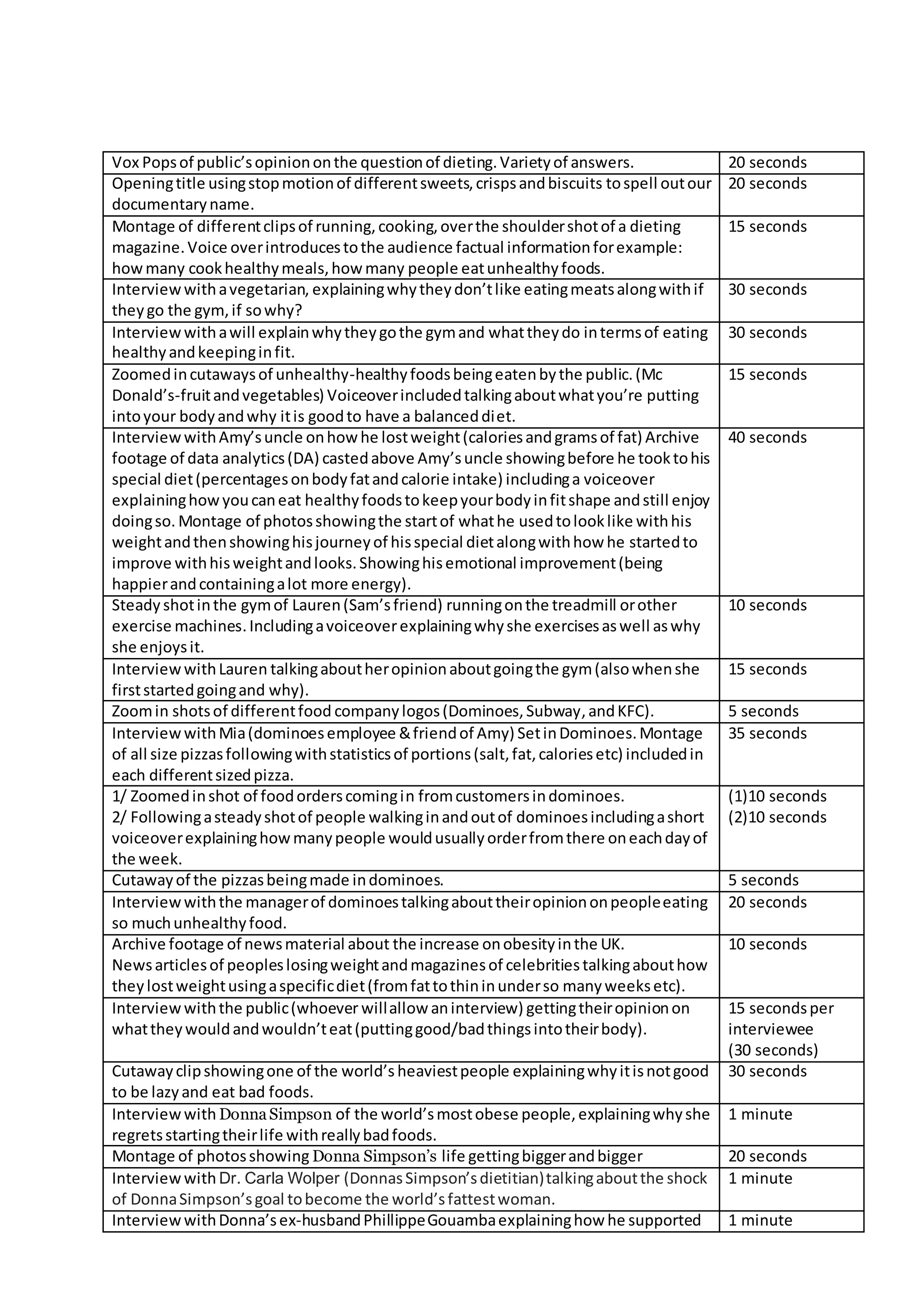 The document outlines a detailed documentary plan exploring public opinions on dieting, contrasting healthy and unhealthy eating habits through interviews, statistics, and visuals. It includes personal stories of individuals like Amy's uncle and Donna Simpson, as well as insights from trainers and dietitians, addressing themes of obesity, fitness, and dietary choices. The documentary also incorporates archival footage and statistics to underline the impact of food choices on health.