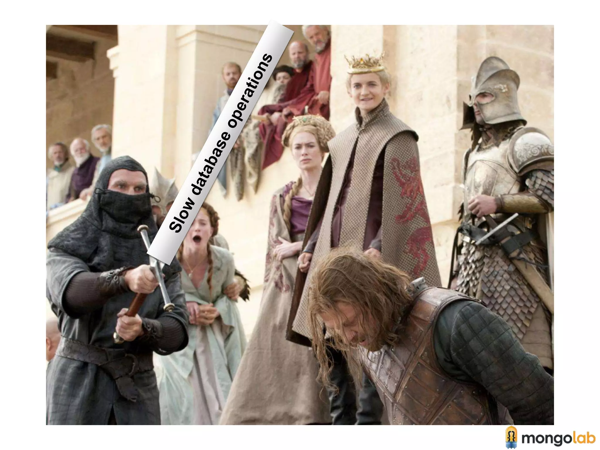 The document discusses modeling data with MongoDB and techniques for optimizing database performance. It uses the example of the Stark family tree to illustrate how to model related data in arrays and embedded documents. It also covers indexing, monitoring operations with currentOp(), and terminating long-running queries or operations with db.killOp() to improve database efficiency.