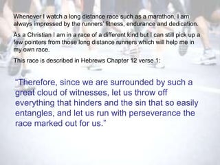 The document compares the endurance required for long-distance running to the spiritual race Christians run, emphasizing the importance of encouragement, perseverance, and removing hindrances. It discusses how faith figures in Hebrews provide motivation, the necessity of discipline and guidance from God, and the role of the Holy Spirit in sustaining a believer's journey. Ultimately, it encourages Christians to focus on the prize of eternal life and run their unique race with purpose and unity within the church community.
