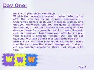 This document provides a 14-day plan for setting up and running a social media campaign. It outlines the key activities for each day, including deciding the campaign message and offer, sharing the message across platforms, listening to and engaging with feedback, reminding people of the campaign, and thanking participants at the end. The goal is to build support and awareness over the two weeks and evaluate what platforms and messages are most effective.