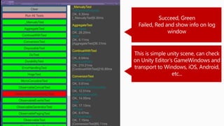 This document discusses RuntimeUnitTestToolkit, a tool for running unit tests on IL2CPP games. It allows creating unit test classes with public methods that will be automatically registered as tests. Tests can make assertions using the Is method and can be asynchronous by returning IEnumerator. It works with UniRx and allows testing asynchronous coroutines. The tool focuses on play time testing and supports running tests on actual devices.