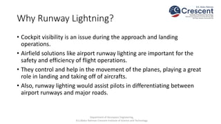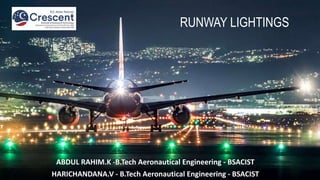 Runway lighting systems are essential for aircraft safety during landing and takeoff operations. They provide guidance and help pilots properly navigate runways. The document discusses various lighting systems including runway edge lights, threshold lights, approach lights, centerline lights, touchdown zone lights, taxiway lights, and visual approach slope indicator lights. Precision approach lighting configurations are specified for CAT I, II, and III runways to guide aircraft during instrument approaches.