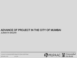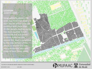 The document describes a project to redevelop a 1.68 acre slum area in Mumbai called Jijimata Nagar that is home to over 3,500 old houses and 20,000 residents. The goal of the project is to rebuild the slum into a new residential area with shops. The design proposes dividing the area into segments along main roads, with housing blocks arranged in rows. Individual units will be improved from existing 15-20 sqm homes lacking bathrooms to new 25 sqm units with 3 rooms and private bathrooms. Buildings will be arranged around a central courtyard and connected by a network of streets to enhance mobility and connectivity both within the community and to the outside area.