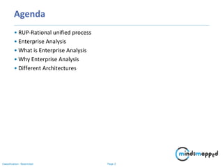 The document outlines the Rational Unified Process (RUP), an iterative software development framework developed by IBM, detailing its phases: inception, elaboration, construction, and transition. It explains the roles of workers, activities, artifacts, and workflows, emphasizing the importance of enterprise analysis in identifying business needs and requirements. Additionally, it defines different architectures including business, information, application, technology, and security architectures.