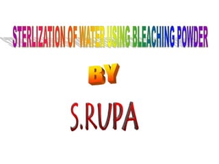Bleaching powder is used to sterilize and disinfect water by killing harmful germs and bacteria that can cause diseases. It works by releasing chlorine when mixed with water, following the chemical reaction of CaOCl2 + H2O → Ca(OH)2+Cl2. Bleaching powder sterilizes water through maximum utilization of released chlorine, leaving no impurities and being harmless in minimum amounts, and is a convenient method to kill germs in water.