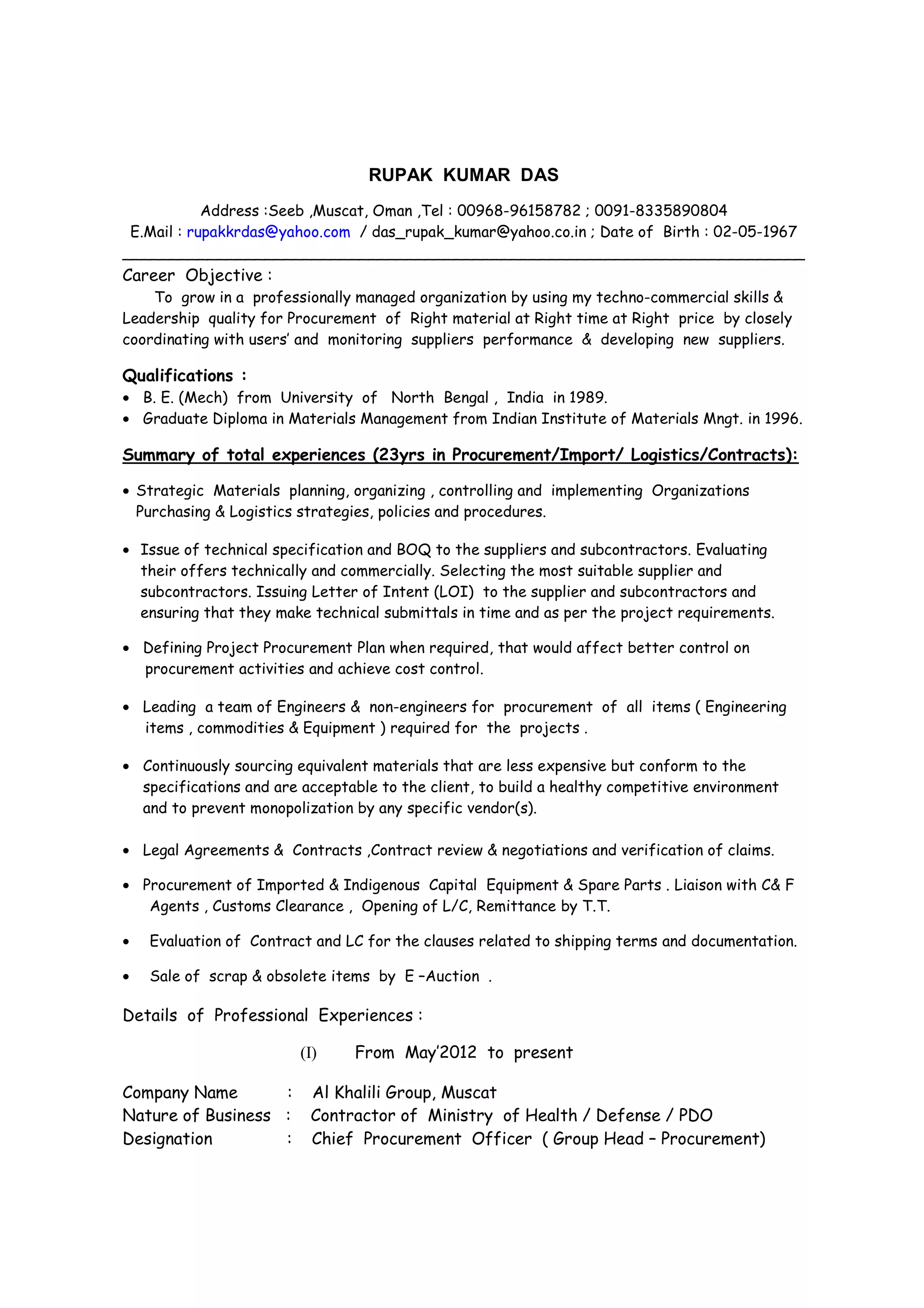 This document provides a summary of Rupak Kumar Das's career experience and qualifications. It outlines his 24 years of experience in procurement, imports, logistics, and contracts management for various companies in India, Oman, and Saudi Arabia. It also lists his educational qualifications which include a B.E. in Mechanical Engineering and a graduate diploma in Materials Management. Details of his professional experience are provided for 7 different roles in procurement and materials management held between 1991 to present.