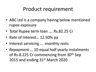 ABC Ltd, an Indian exporter, has a Rs. 82.25 crore term loan at 12.5% interest that it wants to reduce costs on. It receives USD and wants to leverage its net USD receivables. Through a rupee-dollar swap, ABC Ltd can shift its rupee liability to USD at a fixed rate of 62.02. This would reduce ABC Ltd's interest rate to 6.9% while receiving principal repayments in rupees on maturity dates. The swap provides benefits if the rupee depreciates versus the dollar but risks if the rupee appreciates beyond 6.9%. RBI regulations allow such swaps for companies meeting certain criteria to hedge foreign currency exposures.