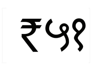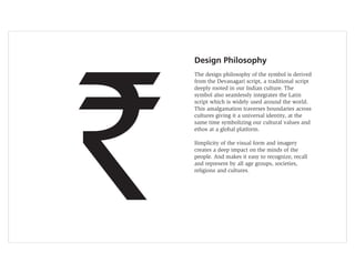 The proposed symbol for the Indian rupee draws from both the Devanagari and Latin scripts to represent Indian culture on a global scale. It uses the Devanagari letter "Ra" and the Latin letter "R" to directly communicate the currency's association with the words "rupiah" and "rupees". Unique features of the Devanagari script like the top horizontal line are preserved to distinguish the symbol as being of Indian origin. The symbol is designed to be simple, familiar, and in harmony with other currency symbols while retaining India's identity.