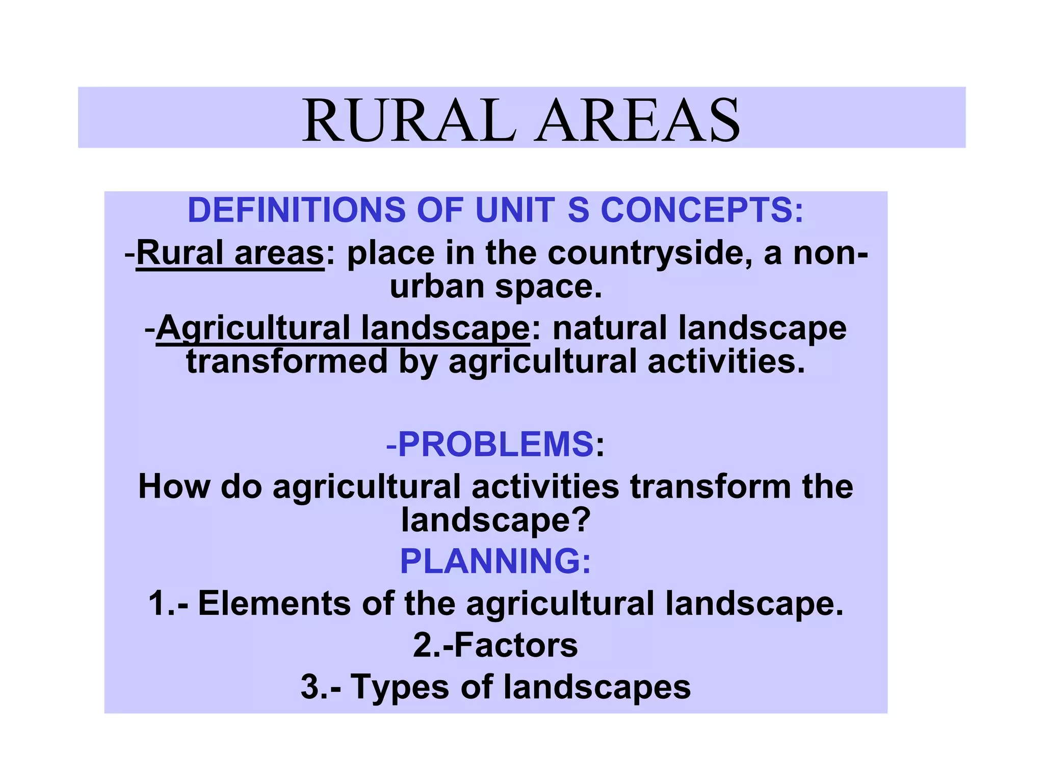 This document defines rural areas and agricultural landscapes. It discusses how agricultural activities transform landscapes through various elements like habitat types, plot characteristics, and factors that influence agricultural landscapes. It identifies physical factors like climate, relief and water as well as human factors like historical, demographic, economic and technical influences. It categorizes agricultural landscapes into subsistence and developed types and provides examples for each, discussing characteristics like traditional techniques, commercialization, technology and productivity.