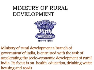 The Ministry of Rural Development is responsible for accelerating socio-economic development in rural India through programs focused on health, education, drinking water, housing, and roads. It consists of the Department of Rural Development and Department of Land Resources. The key objectives are to generate employment, improve standards of living, and build infrastructure. Major schemes include Pradhan Mantri Gram Sadak Yojana for rural road connectivity, Swarnjayanti Gram Swarozgar Yojana for self-employment, Indira Awas Yojana for housing, and the National Social Assistance Programme for welfare benefits. CAPART was established to coordinate voluntary organizations working in rural development.