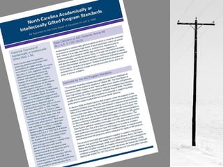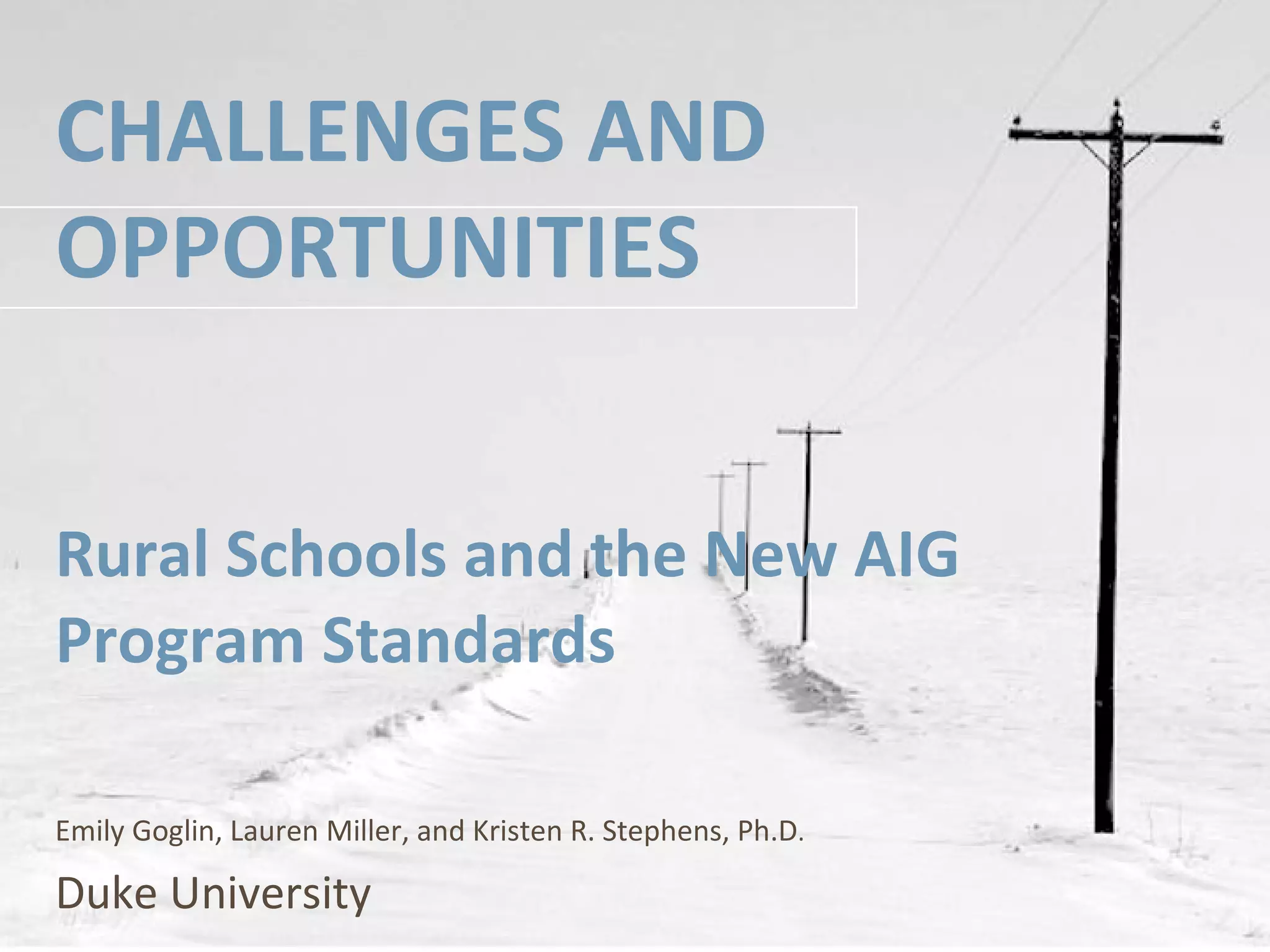 This document discusses challenges and opportunities for rural schools in meeting North Carolina's new AIG (academically or intellectually gifted) program standards. It notes that rural schools face issues like sparser populations, fewer resources, and less access to qualified teachers. It examines challenges and needs related to differentiated curriculum, professional development, comprehensive planning, and partnerships. Suggested strategies include collaborating with other districts, advocating for more support, exploring online resources, and thinking creatively about programming and staff development. Representatives are available to answer additional questions.