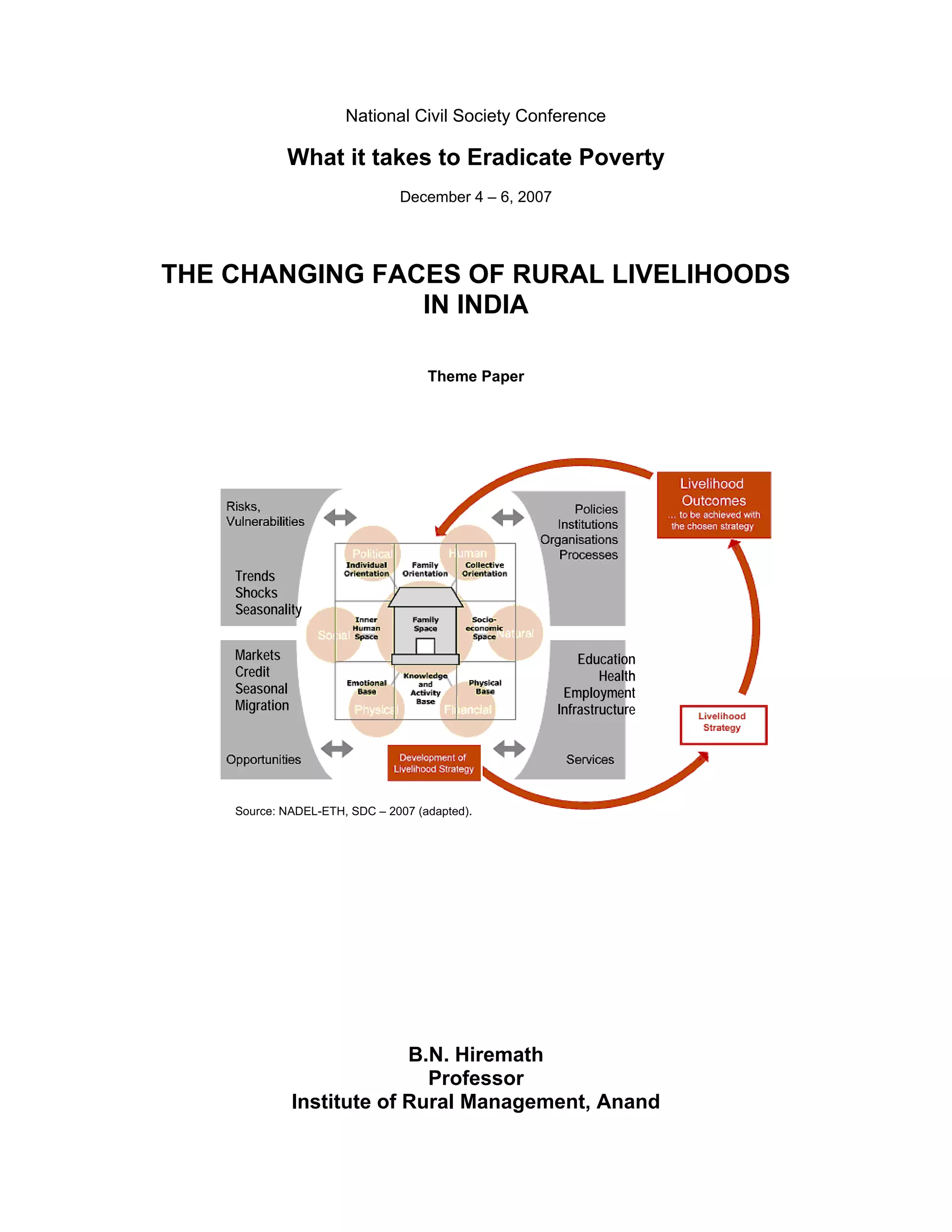 This document discusses the changing nature of rural livelihoods in India. It notes that while India's economy has grown, many rural areas still face poverty and food insecurity. Rural livelihoods increasingly rely on non-farm activities as agriculture alone often cannot support families. The document examines trends in agriculture, including a shift to cash crops over food crops, declining food intake, and threats to small farmers' livelihood security and food security. It argues for understanding rural livelihoods holistically rather than through any single lens.