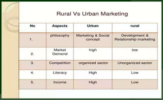 Rural marketing involves assessing, stimulating, and converting rural consumers' purchasing power into effective demand for specific products and services. It is a two-way process involving both urban to rural and rural to urban transactions.