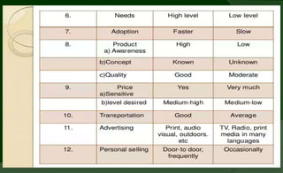 The marketing mix, or 4Ps, refers to product, price, promotion, and place strategies used by companies to market brands in rural areas. Products go through different life cycle stages from introduction to growth, maturity, saturation, and decline. Rural