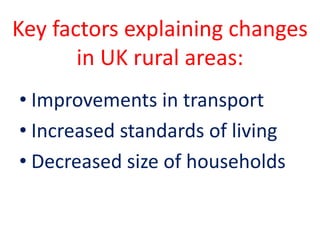 Rural areas in the UK have seen significant changes due to improvements in transport and technology. Villages have grown rapidly due to an influx of commuters, losing their original character. For example, Gower Village has become suburbanized. Second homes provide both advantages through economic benefits but also disadvantages like increased housing prices and traffic. Rural depopulation is an issue as seen in the remote Scottish island of Iona, which has faced a declining population, aging demographics, and lack of jobs and services for youth.