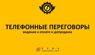 Документ обсуждает проблемы с неоплаченными счетами и необходимость улучшения навыков менеджеров по продажам для увеличения дохода компании. Указано, что 25% счетов остаются неоплаченными, что приводит к значительным потерям. Предлагается тренинг по телефонным переговорам и допродажам для повышения эффективности работы с клиентами.