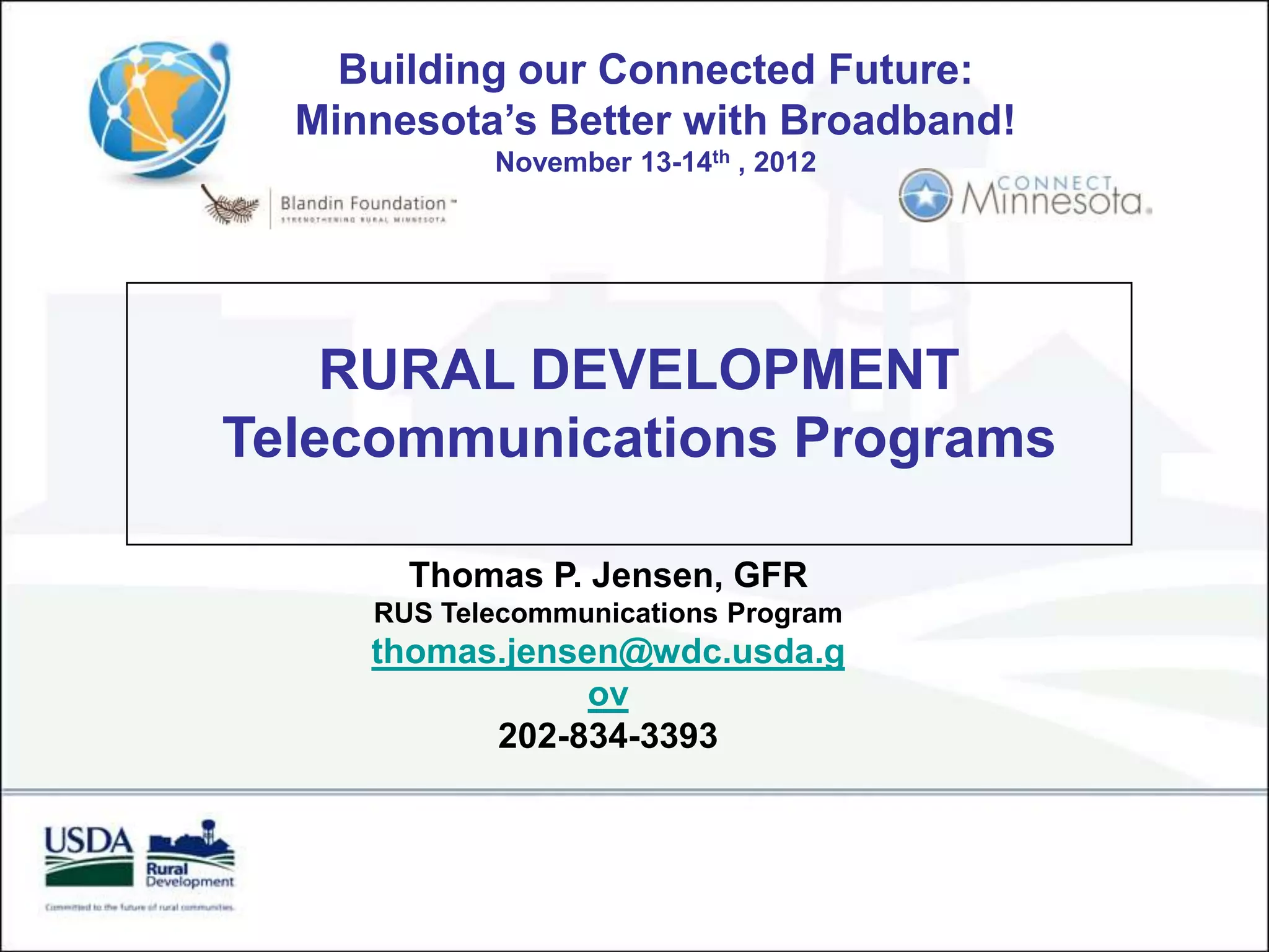 The document summarizes the Rural Utilities Service (RUS) Telecommunications Program. It discusses the program's history from 1949 to today, providing broadband loans and grants. It outlines funding amounts for infrastructure loans, broadband loans, and grants. It also describes considerations for service providers seeking financing, including challenges in obtaining funding given high construction costs and low subscriber densities in rural areas.