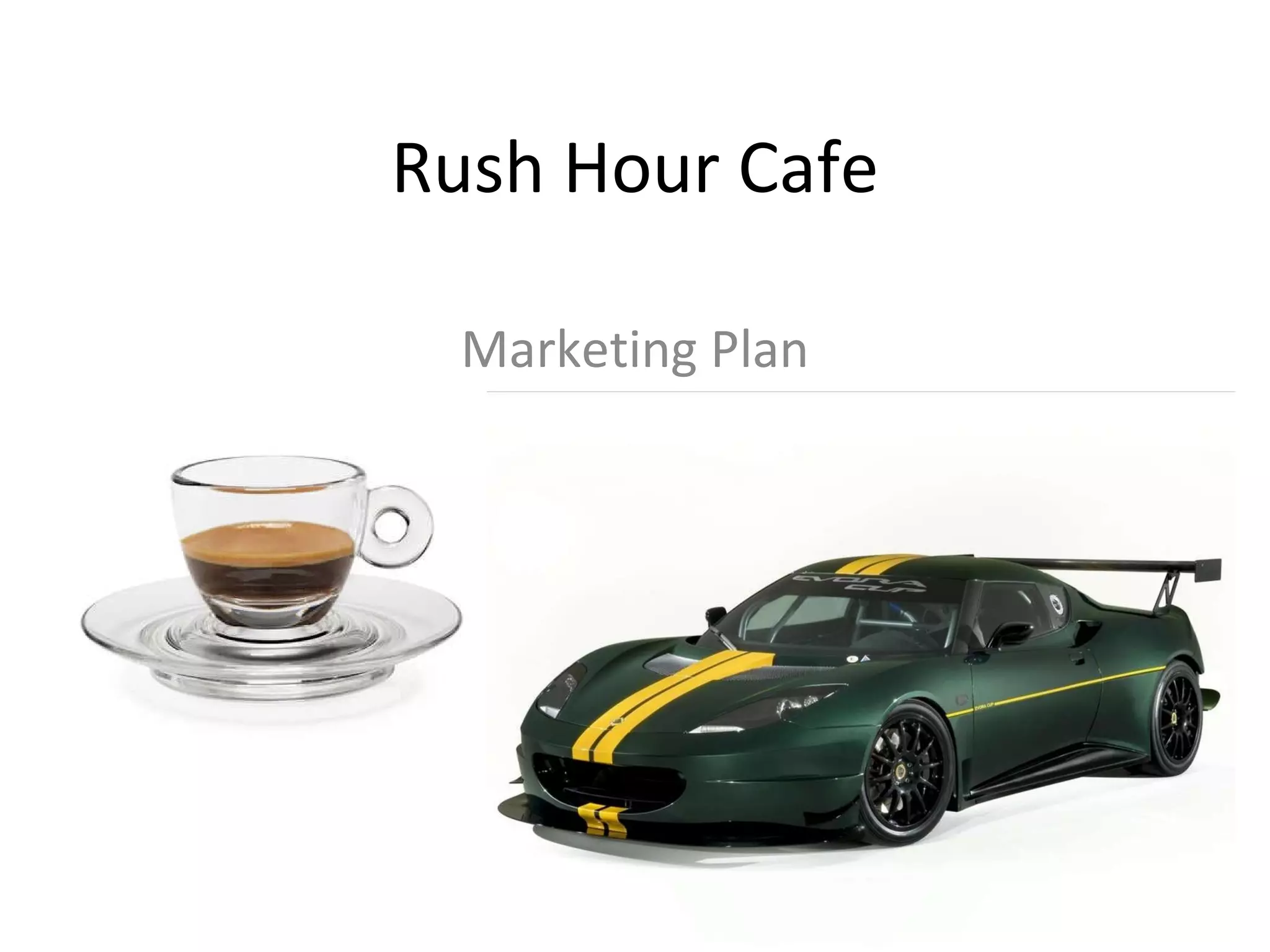 Rush Hour Cafe is a coffee shop and cafe with an auto racing theme located near a college campus. It aims to attract young professionals and college students with high quality coffee and drinks in a modern atmosphere. The cafe is starting with a $30,000 microloan to cover startup and operating costs for 3 months. It will target these demographics through advertising on radio, newspapers, and social media to build awareness of the cafe and drive traffic. The cafe plans to offer coffee, teas, smoothies and pastries for sale at affordable premium prices to reach its financial goals of profitability within 6 months.