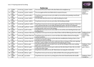 This document is a rushes log created by editor Lucy Pratt for the production "From OutsideIn". It provides details on 53 video files and 5 audio files recorded for the production, including file names, durations, and notes on possible edits. For each file, Pratt recommends precise timecode ranges to crop in order to cut unwanted footage like the actor moving behind the camera or adjusting equipment. Background noises are also noted that may need replacing in post-production. The level of detail in the log will help Pratt efficiently edit the materials down to the essential scenes for the final cut.