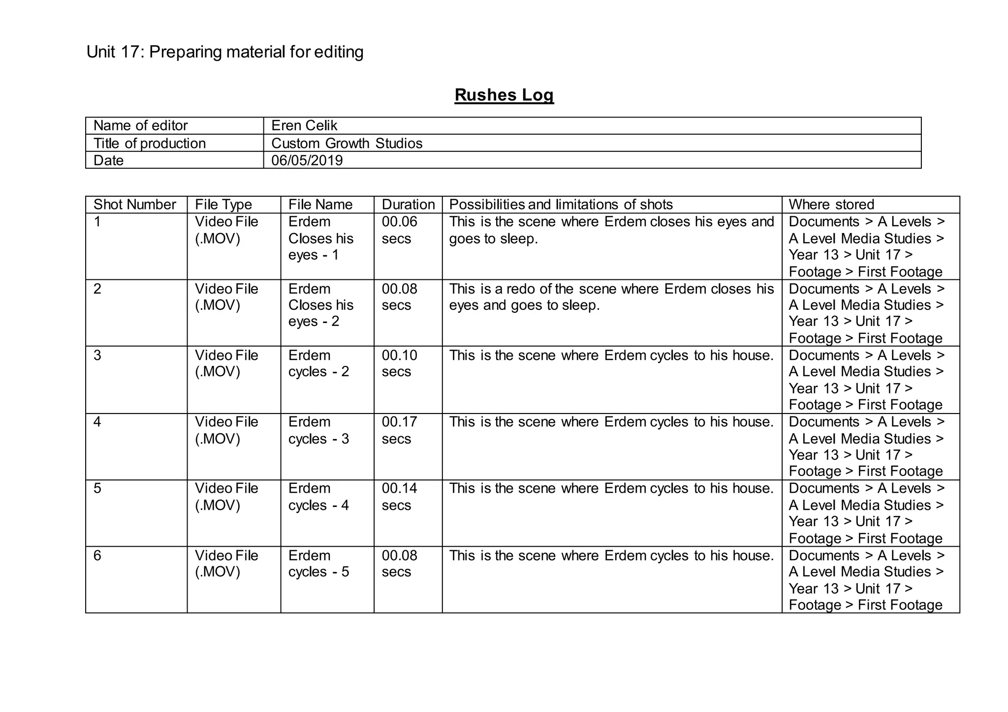 This rushes log from editor Eren Celik contains details of 44 video clips filmed for the production "Custom Growth Studios". Each clip is listed with its file name, duration, brief description and file location. The clips depict scenes of the character Erdem cycling, walking around his house and garden, interacting with his phone, and being attacked by a monster. Many of the clips will need to be trimmed or cut to shorten their duration for the final edited video.