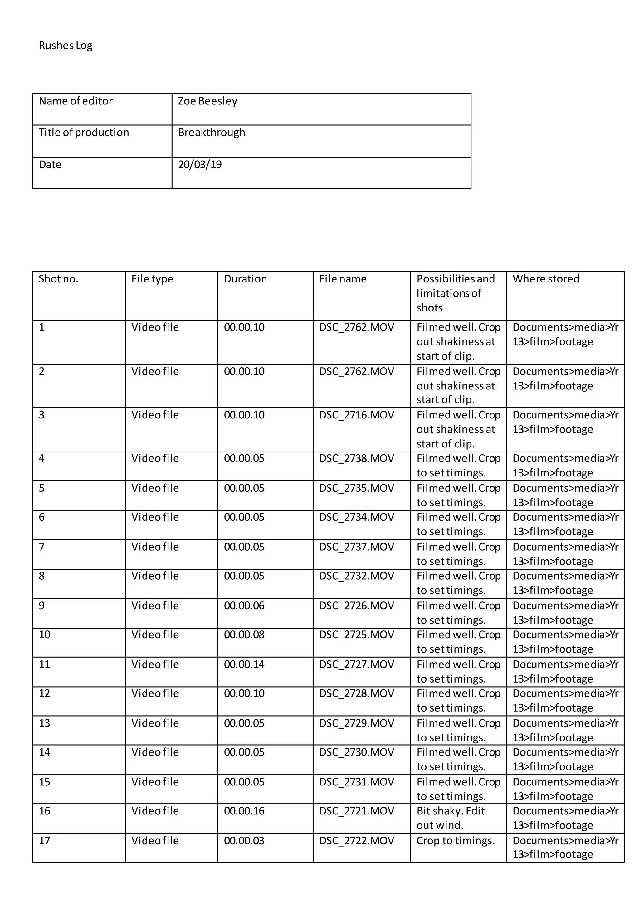 This document is a rushes log created by Zoe Beesley for the production "Breakthrough" on 20/03/19. It contains details of 74 video clips including file names, durations, possible editing requirements such as cropping or speed adjustments, and file locations. The majority of clips will require cropping to match timings or eliminate shaky footage, while some may need adjustments to brightness, speed, or specific areas selected.
