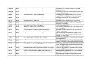 Eleanor West produced a music video and created a rushes log to document the various footage shots taken and whether they were used or not. The log contains over 30 video clips ranging from 2 seconds to 48 seconds in length, with descriptions of each shot and comments on its suitability. Many clips could not be used due to issues like poor focus, lighting, or movement that did not fit the theme of the music video. Other clips required retakes or had parts cut out to make them work better. In the end, Eleanor was able to incorporate various sections of different clips throughout the final music video.