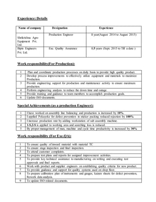 Rushikesh Ramesh Deshpande is seeking a challenging job where he can utilize his knowledge and skills. He has 2.5 years of experience as a Quality Engineer and Production Engineer for food processing equipment and solar water heaters. He holds a Bachelor's degree in Mechanical Engineering with 66.60% and has expertise in techniques like 5S, Kaizen, Pokayoke, and Lean. His responsibilities have included quality inspection, reducing defects, improving processes, meeting production goals, and updating documentation. He aims to further reduce rejection rates and increase productivity through quality initiatives.