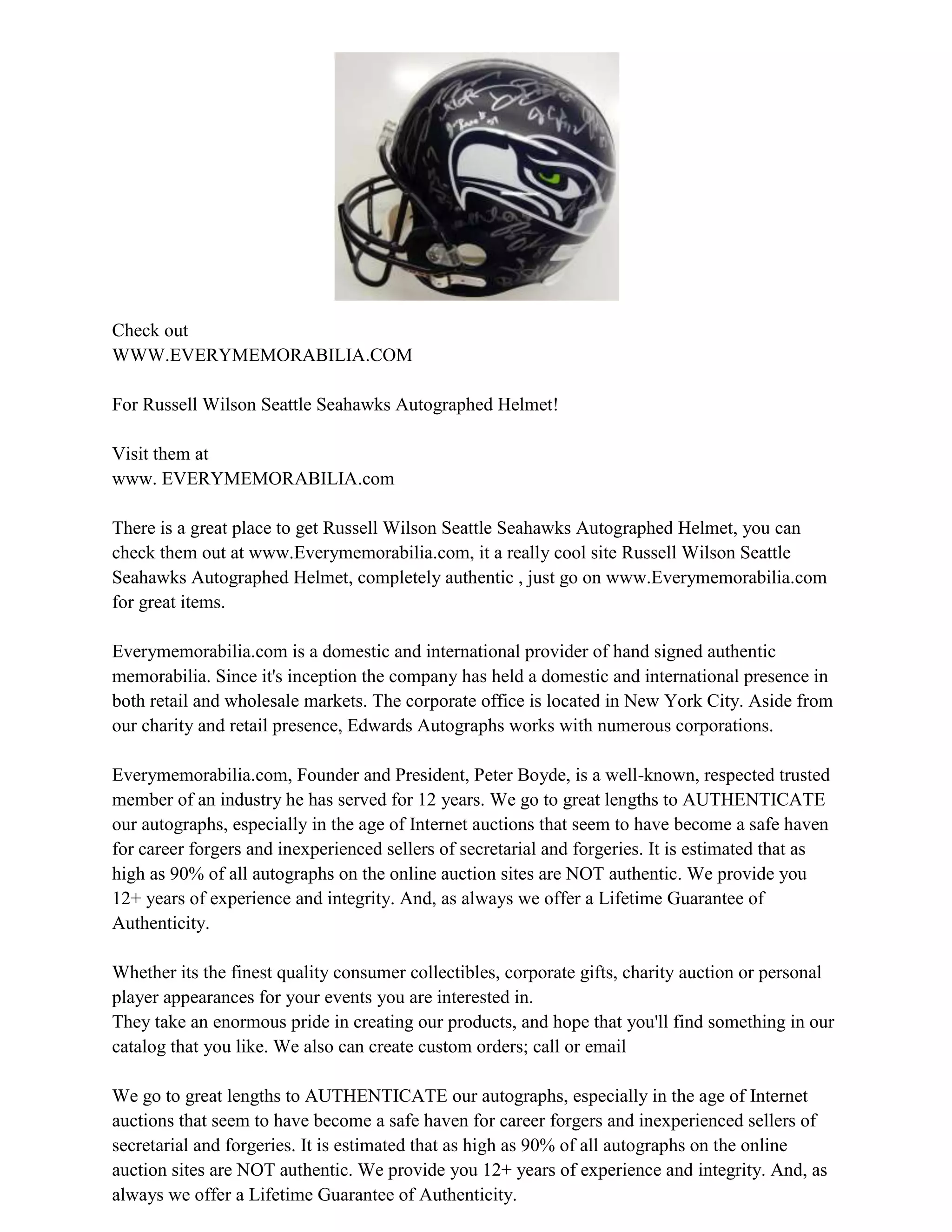 The document promotes the website www.everymemorabilia.com for purchasing authentic signed memorabilia items like a Russell Wilson Seattle Seahawks autographed helmet. The company has been in business for over 12 years and takes steps to ensure the authenticity of its autographed items, unlike many other online sellers where an estimated 90% of autographed items are forgeries. Customers can find officially licensed collectibles, corporate gifts, or arrange for personal player appearances through the website or by contacting the company directly.