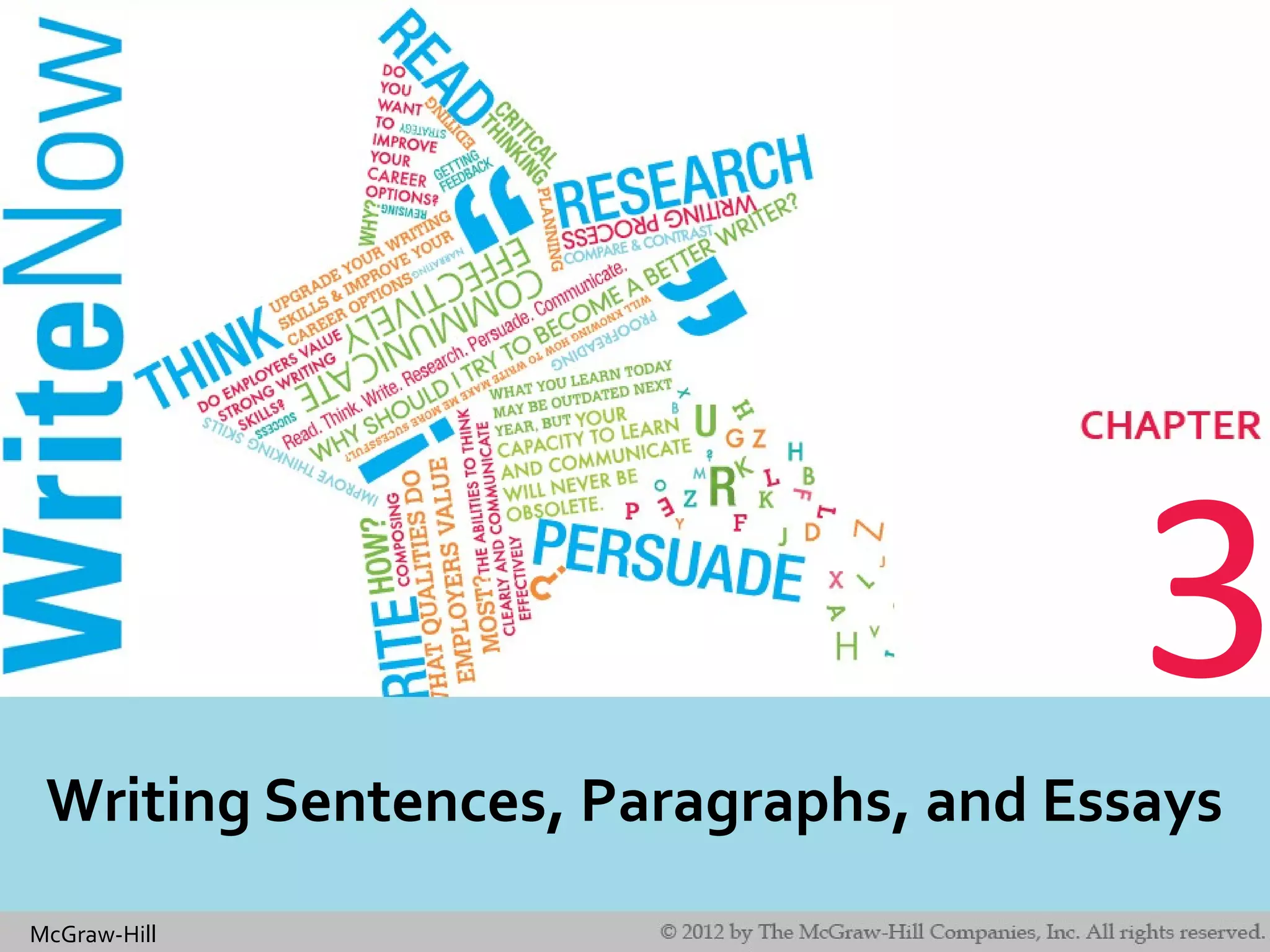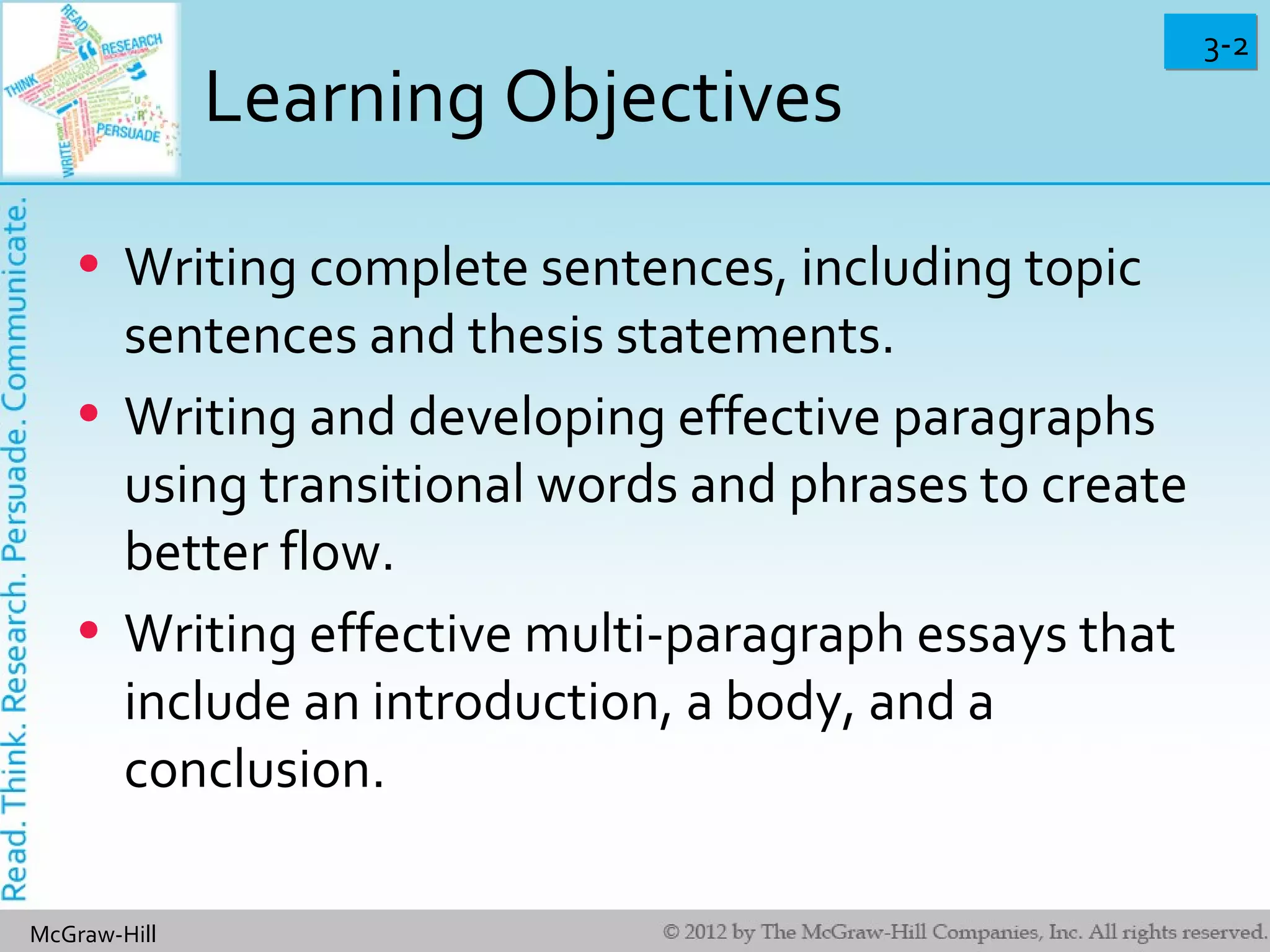 This document provides instruction on writing sentences, paragraphs, and essays. It defines key concepts like complete and incomplete sentences, parts of speech, topic sentences, thesis statements, and essay structure. The learning objectives are to teach writing complete sentences, developing effective paragraphs using transitions, and writing multi-paragraph essays with an introduction, body, and conclusion. Key elements of paragraphs and essays like topic sentences, supporting details, transitions, conclusions, and attention-getting introductions are also explained.