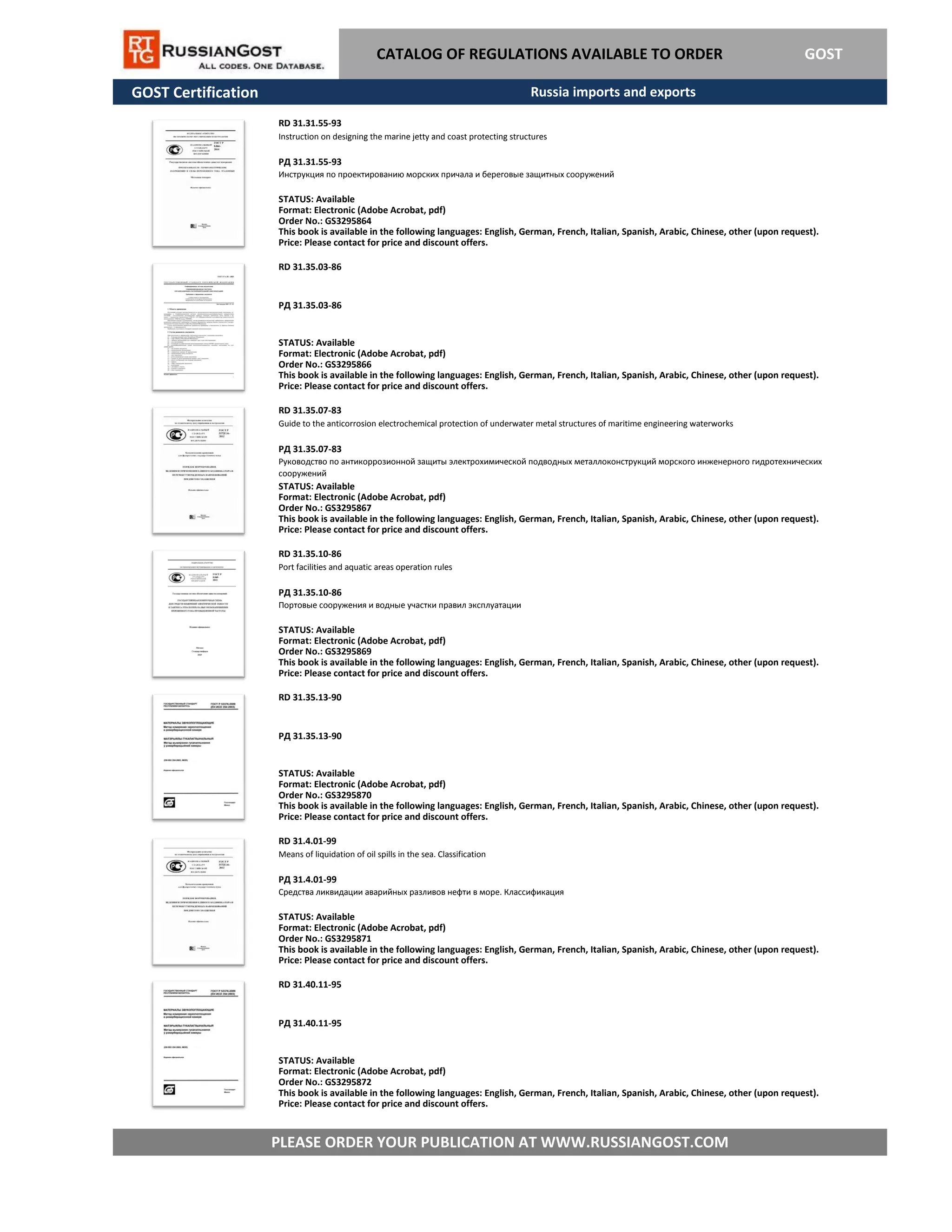 The document lists several GOST certification publications related to maritime engineering and environmental safety, available for electronic order in multiple languages. Each document has an assigned order number and requires contact for pricing and discount information. The certificates cover topics such as oil spill liquidation, anticorrosion protection, and port facility operation rules.