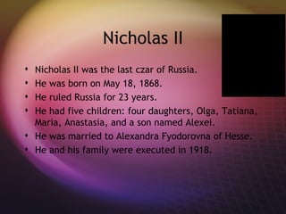 The document summarizes key events and figures related to the fall of the Romanov dynasty in Russia and the Russian Revolution. It describes Nicholas II as the last Czar who ruled until 1918 when he and his family were executed. It also discusses Rasputin's influence over the royal family, the leaders of the provisional government and Bolsheviks like Lenin, and major events that contributed to the revolution such as Bloody Sunday and the February and October Revolutions.