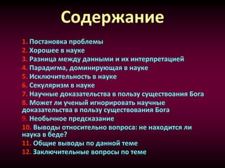 Документ обсуждает кризис в науке, исследуя конфликты между научными данными и религиозными убеждениями, особенно в контексте интерпретации данных и доминирующих парадигм. Автор акцентирует внимание на том, что наука может игнорировать важные аспекты, включая религиозные, и призывает к более открытым подходам в научных исследованиях. Также рассматриваются примеры ошибок в научных интерпретациях и обсуждаются последствия упрямства научных парадигм.