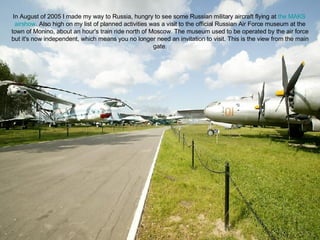 The Russian Air Force Museum in Monino, Russia houses a collection of rare Soviet and Russian aircraft, including the largest helicopter ever built, the V-12. It also features experimental aircraft like the T-4 supersonic bomber and early Soviet jets from all major manufacturers. With over 15 helicopters and examples of every Russian fighter type, the museum provides a unique look at Russian aviation history.