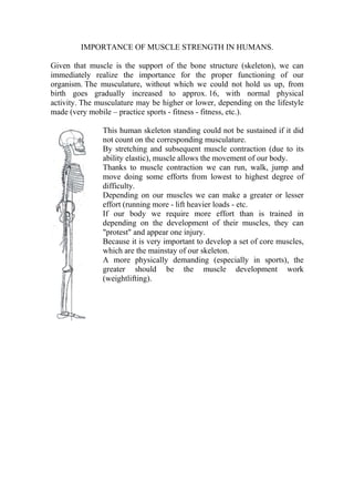 This document provides instructions for a more efficient and revolutionary method of strengthening the trunk, legs, and cervical muscles using a strap called the "TIRANTE MUSCULADOR". It describes several exercises that can be performed with the strap to target key muscle groups like quadriceps, hamstrings, glutes, lower back, and cervical muscles. The exercises are eccentric/stretch-based and provide benefits like increased flexibility, strength and muscle elasticity with minimal risk of injury compared to other weight training methods. Recommendations are given for proper use of the strap in training routines, especially for athletes, to improve fitness and prevent injuries.