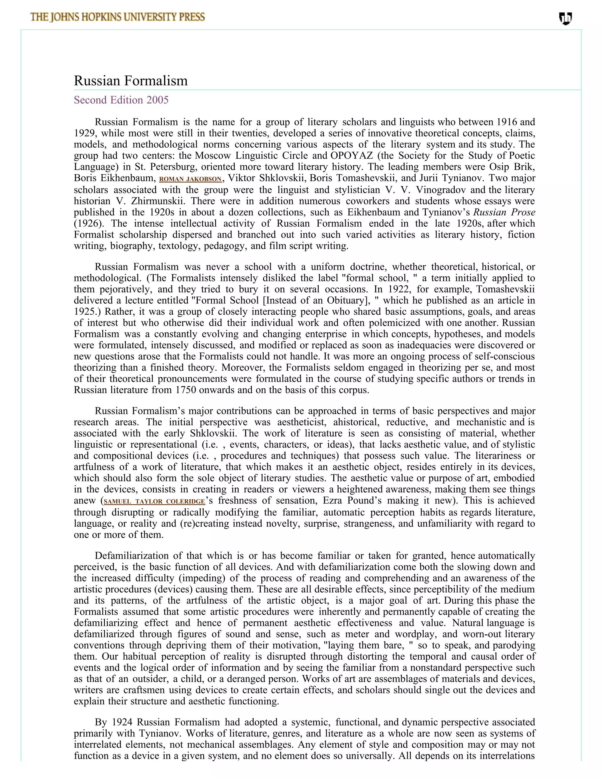 Russian Formalism was a movement of literary scholars and linguists in Russia between 1916-1929 who developed innovative theories about literature. They focused on the formal and technical aspects of literature rather than its content. Over time, their perspectives evolved from seeing literature as mechanical assemblies of devices to understanding works as dynamic systems. They also studied literature as a social and communicative institution that changes over time through generations of writers and schools. Their work established literary studies as an autonomous field and emphasized developing precise concepts and hypotheses to describe and explain literary phenomena.