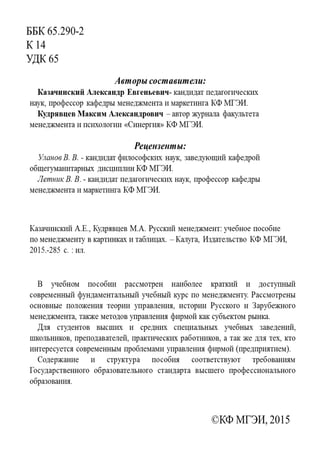 Учебное пособие 'Русский менеджмент в картинках' охватывает историческое развитие управления в России, современные методы менеджмента и образовательные подходы для студентов и специалистов. Оно включает темы от древнерусских управленцев до современных подходов к менеджменту, а также практические рекомендации и примеры успешных компаний. Пособие предназначено для изучения дисциплины менеджмента и соответствует образовательным стандартам.