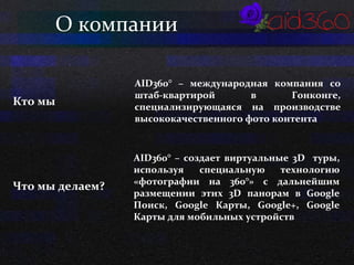 Компания aid360° из Гонконга предлагает услуги по созданию высококачественных виртуальных 3D туров с использованием технологии фотографии на 360°. Она помогает бизнесам привлекать клиентов и повышать узнаваемость в интернете за счет уникальных маркетинговых инструментов. Процесс включает фотосъемку, производство виртуальных сцен и представление готовых туров на платформах Google.