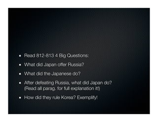 The 1905 Russo-Japanese War ended in a humiliating defeat for Russia, showing that the rule of the Czar was weak and disorganized. After defeating Russia, Japan solidified its control over Korea and established itself as a new imperial power in the region. The Russo-Japanese War contributed to growing discontent within Russia and further weakened the absolute monarchy of the Czar in the lead up to the revolutions of 1917.
