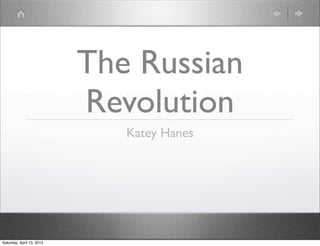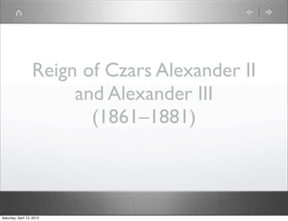 The document summarizes the history of Russia from the reign of Czar Alexander II in the 1860s through the end of the Russian Civil War in 1921. It discusses the emancipation of serfs, the rule of later Czars including Nicholas II, the revolutions of 1905 and 1917 which overthrew the monarchy, the rise of the Bolsheviks under Lenin, and the civil war between the Red and White armies that resulted in victory for the Communists. Key events included Bloody Sunday, World War I, the abdication of Nicholas II, and the executions of Rasputin and the Romanov family.