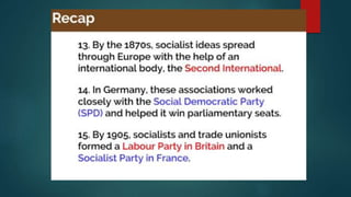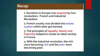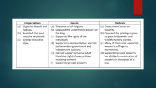 The document discusses the impact of the French Revolution and the spread of new ideas about individual rights and social power. It led to varied responses across Europe, with some wanting gradual change and others desiring a radical restructuring of society. There emerged three main groups - conservatives who wanted to preserve the status quo, liberals who favored limited reforms, and radicals who pushed for widespread changes to society. The document examines the political divisions that arose in the aftermath of the French Revolution across Europe regarding approaches to social and political transformation.