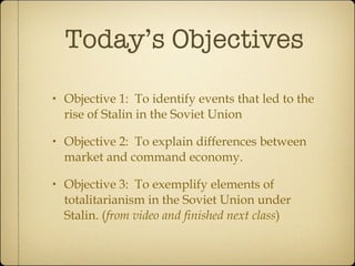 The document provides background information on the events leading up to the Russian Revolution and the rise of Stalin in the Soviet Union. It discusses the autocratic rule of the Tsars, the influence of Marx's ideas, and Lenin and the Bolsheviks' push for radical change. Key events that weakened the Russian monarchy included the Russo-Japanese War, Bloody Sunday, and World War I. In October 1917, Lenin and the Bolsheviks stormed the Winter Palace in Petrograd, overthrowing the provisional government and establishing Soviet rule. Lenin implemented new economic and political policies, including the New Economic Policy, before Stalin later rose to power and established a totalitarian system under his rule.