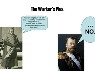 The Russian Revolution was caused by growing unrest against the oppressive rule of Tsar Nicholas II. [1] Factory workers labored for long hours in poor conditions and low pay and joined revolutionary groups like the Bolsheviks calling for change. [2] Figures like Vladimir Lenin and Grigori Rasputin influenced events, with Lenin leading the Bolsheviks to overthrow the monarchy and Rasputin gaining favor with the royal family. [3] This ultimately led to the deaths of Nicholas II and his family at the hands of the Bolsheviks in 1918, ending centuries of imperial rule in Russia.