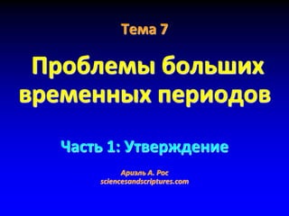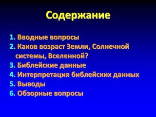 Документ рассматривает вопросы возраста Земли, солнечной системы и вселенной с точки зрения научных данных и библейского Учения. Главный акцент сделан на несоответствии временных рамок, предложенных эволюционистами, и библейскими утверждениями о недавнем творении. Основные выводы указывают на то, что библейское описание творения подтверждает, что жизнь была создана за шесть буквальных дней и что это произошло несколько тысяч лет назад.
