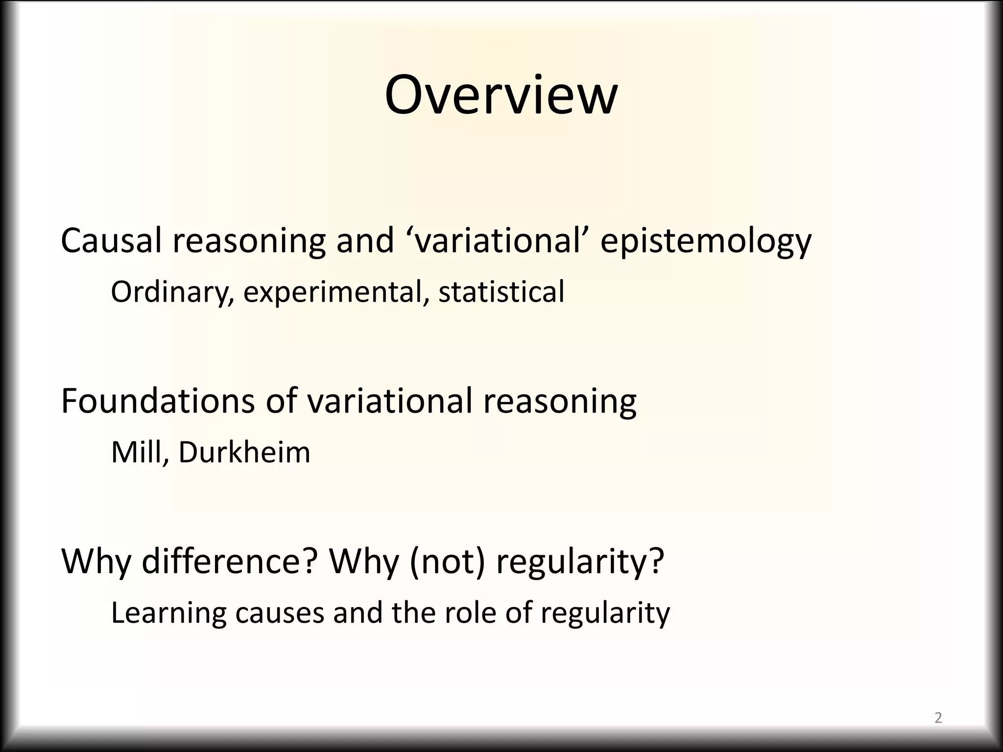 This document discusses the concept of variation in causal discovery and reasoning. It argues that causal discovery relies on the analysis of differences and variations. There are three main types of causal reasoning - ordinary, experimental, and statistical - but they all depend on the evaluation of variations, whether comparing counterfactual scenarios, manipulating putative causes, or studying associations across different levels of exposure. The foundations of this variational approach are traced back to thinkers like Mill and Durkheim, who emphasized the importance of comparing instances where phenomena do and do not occur to establish causal relations. Regularities alone are not sufficient for causal learning; we need variations to detect the factors that make a difference.