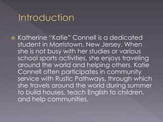 Katie Connell is a dedicated student from Morristown, New Jersey who enjoys traveling the world and helping others through community service with Rustic Pathways. Rustic Pathways provides high-quality travel and service programs for students around the world to build houses, teach English, and help communities while empowering students and bringing people together. Rustic Pathways maintains various community service programs focused on education, infrastructure, environment, health, and economic development by developing projects with local organizations.