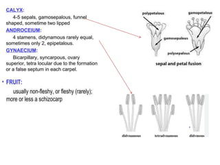 This document provides information on several plant families including Rutaceae, Umbelliferae, Labiatae, Solanaceae, Liliaceae, Myrtaceae, and Rubiaceae. For each family, it describes key characteristics such as habit, leaves, inflorescence, flowers, calyx, corolla, fruit, and important species. It also provides some economic uses of plants from the Umbelliferae family and describes characteristics common across members of the Myrtaceae and Rubiaceae families.