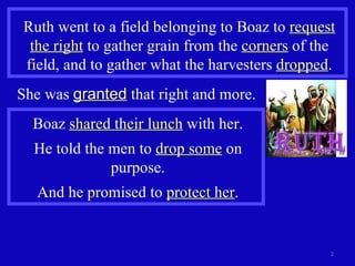 1. Ruth gleaned grain in the fields of Boaz and gathered an ephah of barley. Boaz showed her kindness and told his workers to leave extra grain for her.