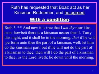 The document discusses the biblical story of Ruth and Boaz, emphasizing themes of kinsman-redeemer and the importance of trust and patience in God's plans. Boaz agrees to marry Ruth after a nearer kinsman declines, ensuring that the family line continues. It draws parallels between the story and the relationship believers have with God, highlighting the call to embody God's love and character in their lives.
