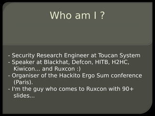 The document introduces PMCMA, a debugger tool that analyzes memory corruption bugs by forcing processes to fork, overwriting memory locations in the offspring processes, and monitoring execution to map exploitable scenarios. PMCMA aims to provide a roadmap for exploitation by identifying vulnerabilities and possible exploitation techniques like truncating function pointers or exploiting 4-byte aligned memory writes. The tool is available online and has received over 10,000 downloads in its first two months.
